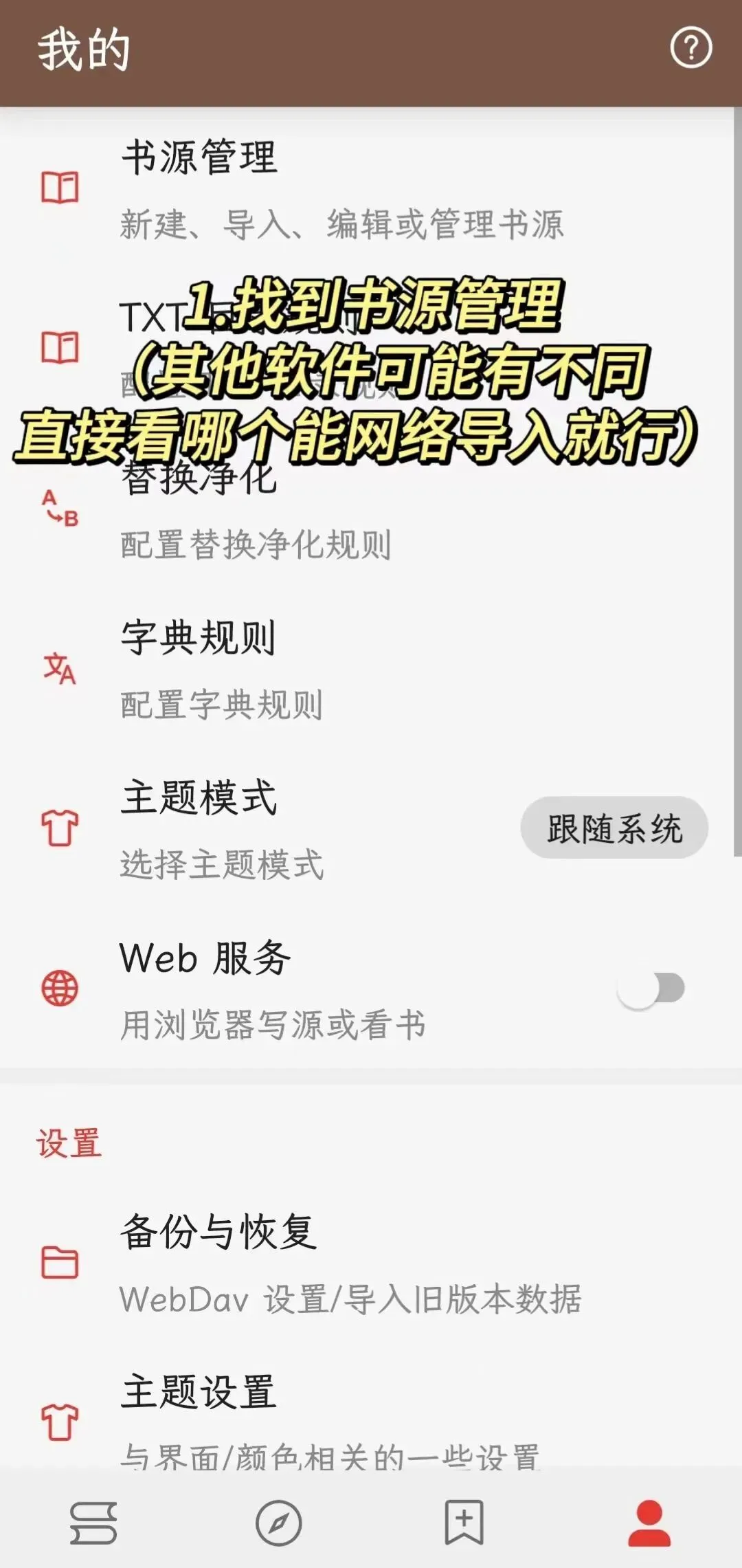 点击「我的」→「书源管理」