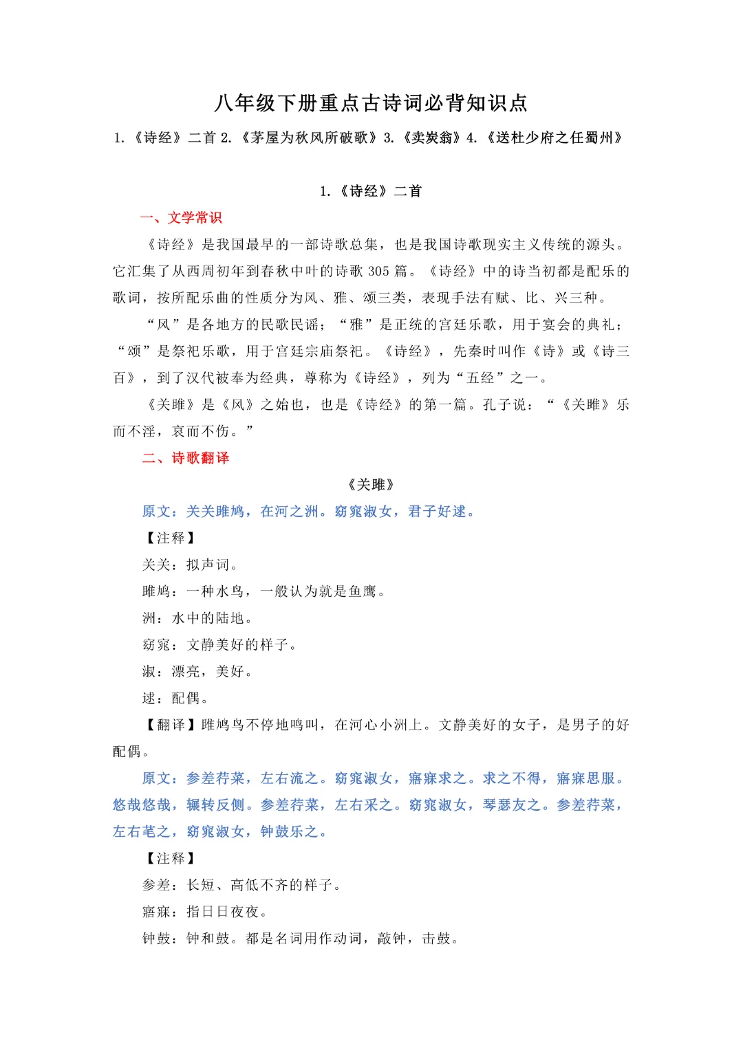 今日给大家分享的是:【八年级下册语文人教部编版】初二下册语文重点古诗词必背知识点|完整高清电子版可打印