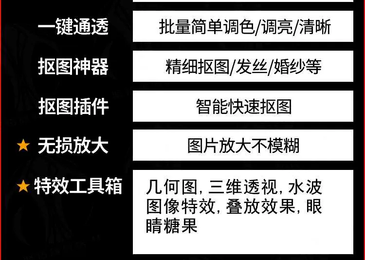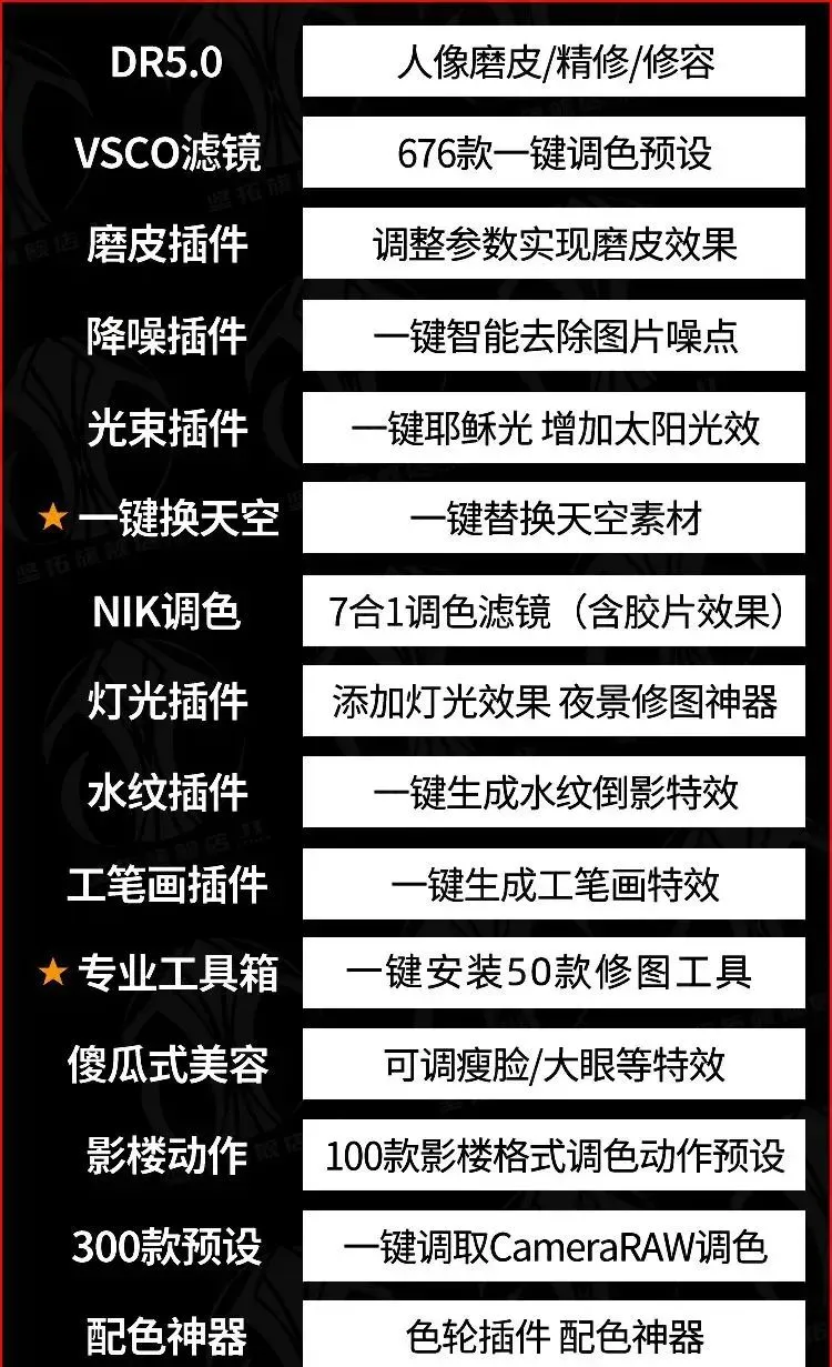 可选择单独安装,也可以一键安装所有,此插件套装涉及:磨皮,调色,一键换天空,丁达尔光效,水波纹,工笔画,配色,抠图,无损放大… 比较多,就不一一介绍了,大家懂得懂得。