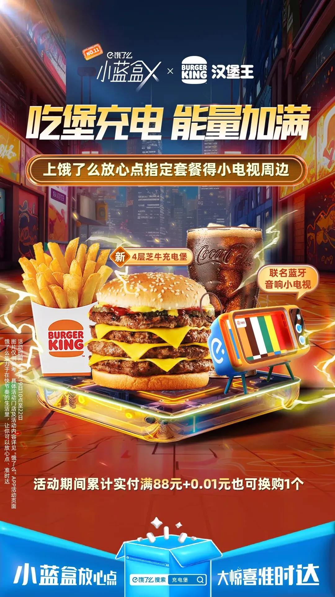10月19日10点至22日期间,饿了么小蓝盒X携手汉堡王,推出「吃堡充电 能量加满」活动。用户可以在饿了么点「充电堡」专属套餐,随餐获赠联名蓝牙音响小电视,实现惊喜周边准时达。还可通过在饿了么平台购买汉堡王商品累计实付满88,即可一分钱换购联名蓝牙音响小电视。两种渠道相同福利,方便不同用户根据自己的情况选用最便捷的方式获取福利,可谓是创意满满又贴心满满。