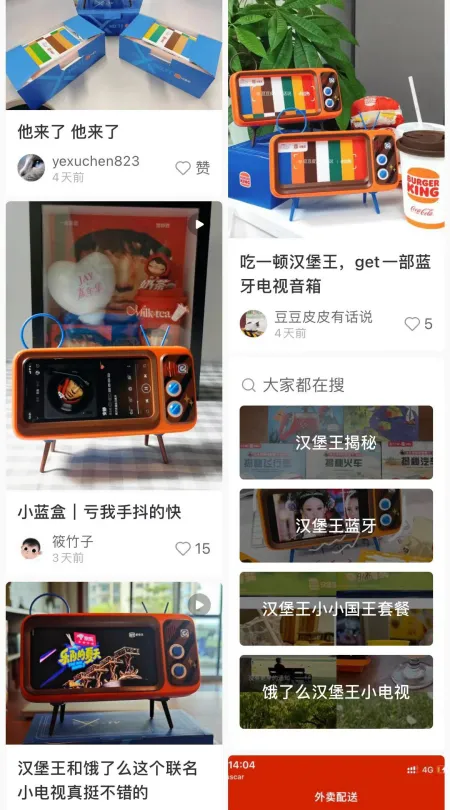 除了饿了么站内的趣味玩法,双方还在站外多个社交媒体平台实现内容营销的共振,利用内容持续种草联名蓝牙音响小电视,为饿了么站内引流。在小红书上,种草达人发布开箱美图,惊喜感满满的包装、丰富可调的配件满足用户好奇心,在消费者心智中为汉堡王留下“好吃又好玩”的品牌印象。