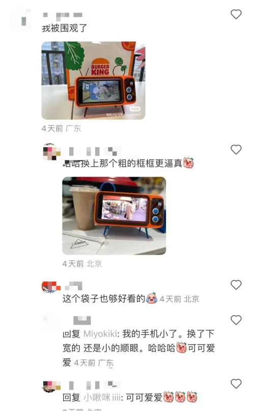 用户们也纷纷在各大平台晒出周边美照,发出“被这个周边的颜值迷住了!”、“作为一个资深干饭人,我不允许自己没有它!”、“这个小音响也太好玩了吧!”、“这简直就是午休神器!”等感叹。抢到周边的用户也在评论区互动晒出了自己的小电视,一起交流“被围观”的经验。