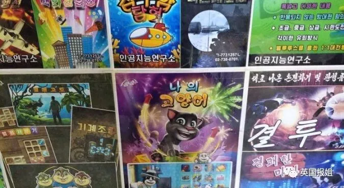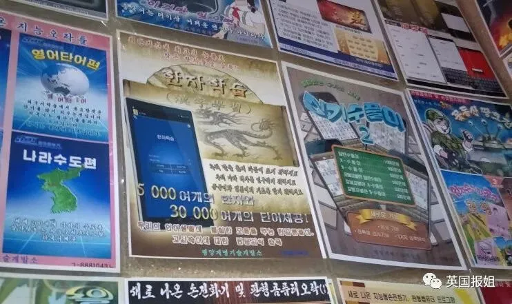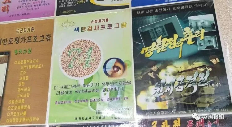 而朝鲜的手机应用商城就特别的显眼了,在店铺里面会贴上各式各样的app宣传单,有些店铺基本上会把一堵墙给贴满。其中这些宣传单里面以游戏宣传单居多: