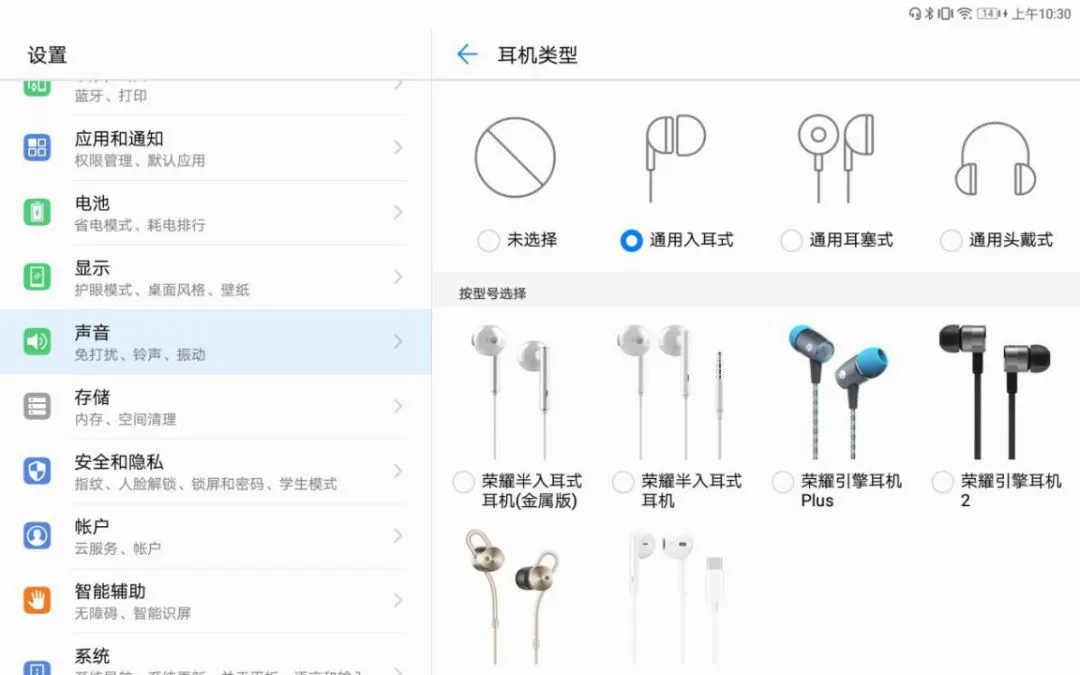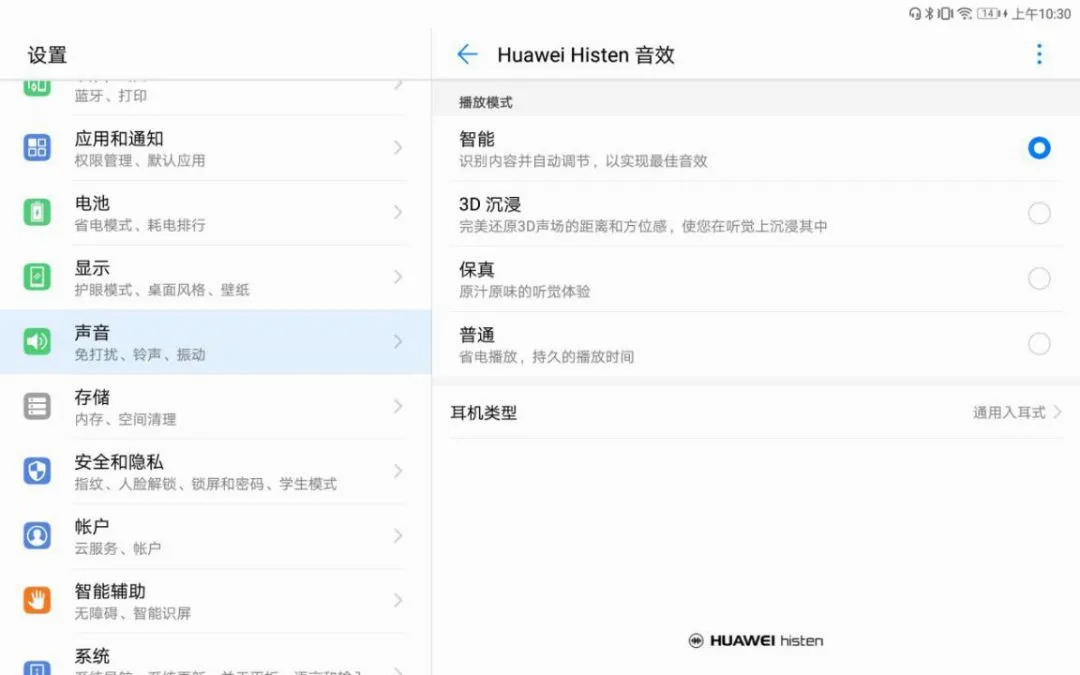 插入耳机后,荣耀平板 5 内置的华为 Histen 音效就可以使用了,除了针对华为和荣耀的耳机有特殊调校外,还可以设置你自己的耳机类型,以拥有更好的体验。