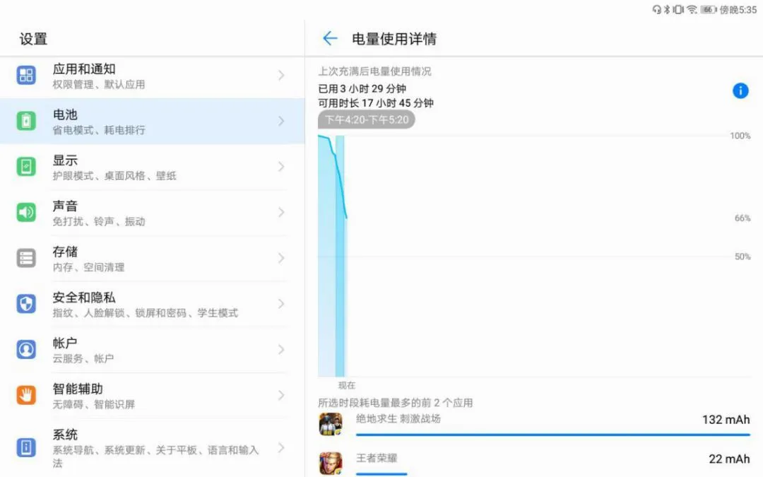 荣耀平板 5 内置了一块 5100 毫安的大电池,近一个半小时的游戏下来,耗电约 13% 左右,游戏结束后背部 LOGO 附近最高温度为 32.7°;在一个半小时的播放在线视频测试中,约耗电 17%,如此重度使用八九个小时没有问题。充电速度方面,从 30% 到充满电耗时约 2 小时 15 分,在可以接受的范围之内,毕竟平板不像手机那样使用频率太高,快充是刚需。