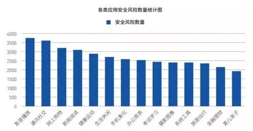 其中,影音播放类Android应用存在的安全风险数量最多,其次是通讯社交和网上购物类应用。相对于其他类型的移动应用,这三类应用的产品功能和交互方式都较丰富,且具有较高的用户黏性。存在其中的安全风险一旦爆发,影响的用户量级和范围将大大超乎预期。