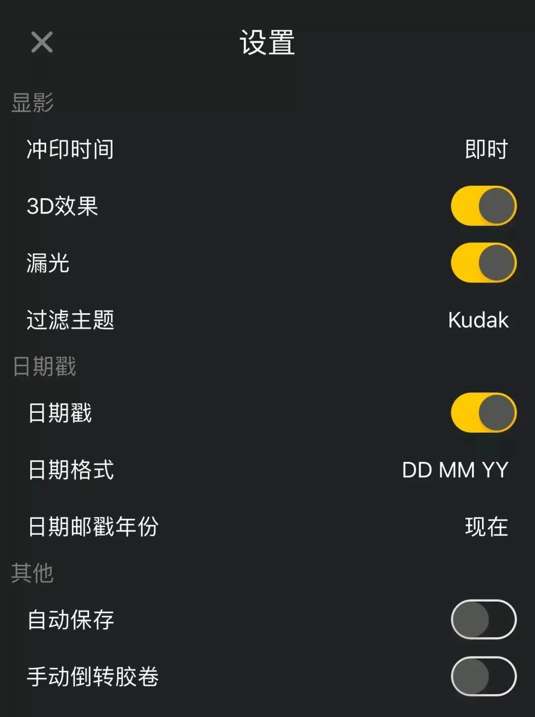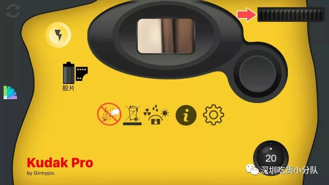 界面就是一个黄色的相机(会员可换色),把胶片相机模拟得很真实。