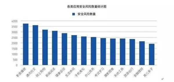 《白皮书》数据显示,影音播放类Android应用存在的安全风险数量最多,其次是通讯社交和网上购物类应用。相对于其他类型的移动应用,这三类应用的产品功能和交互方式都较丰富,且具有较高的用户黏性。存在其中的安全风险一旦爆发,影响的用户量级和范围将大大超乎预期。