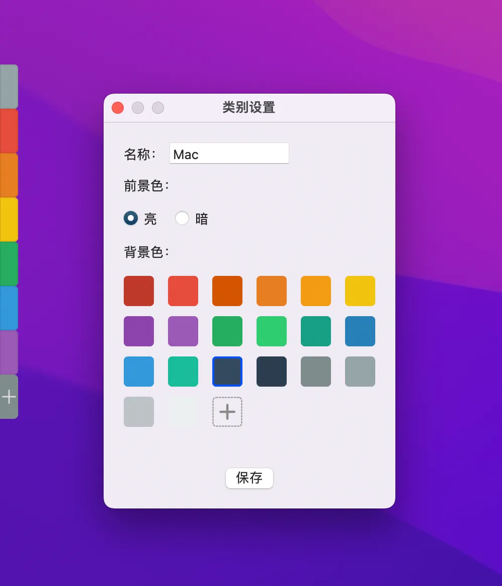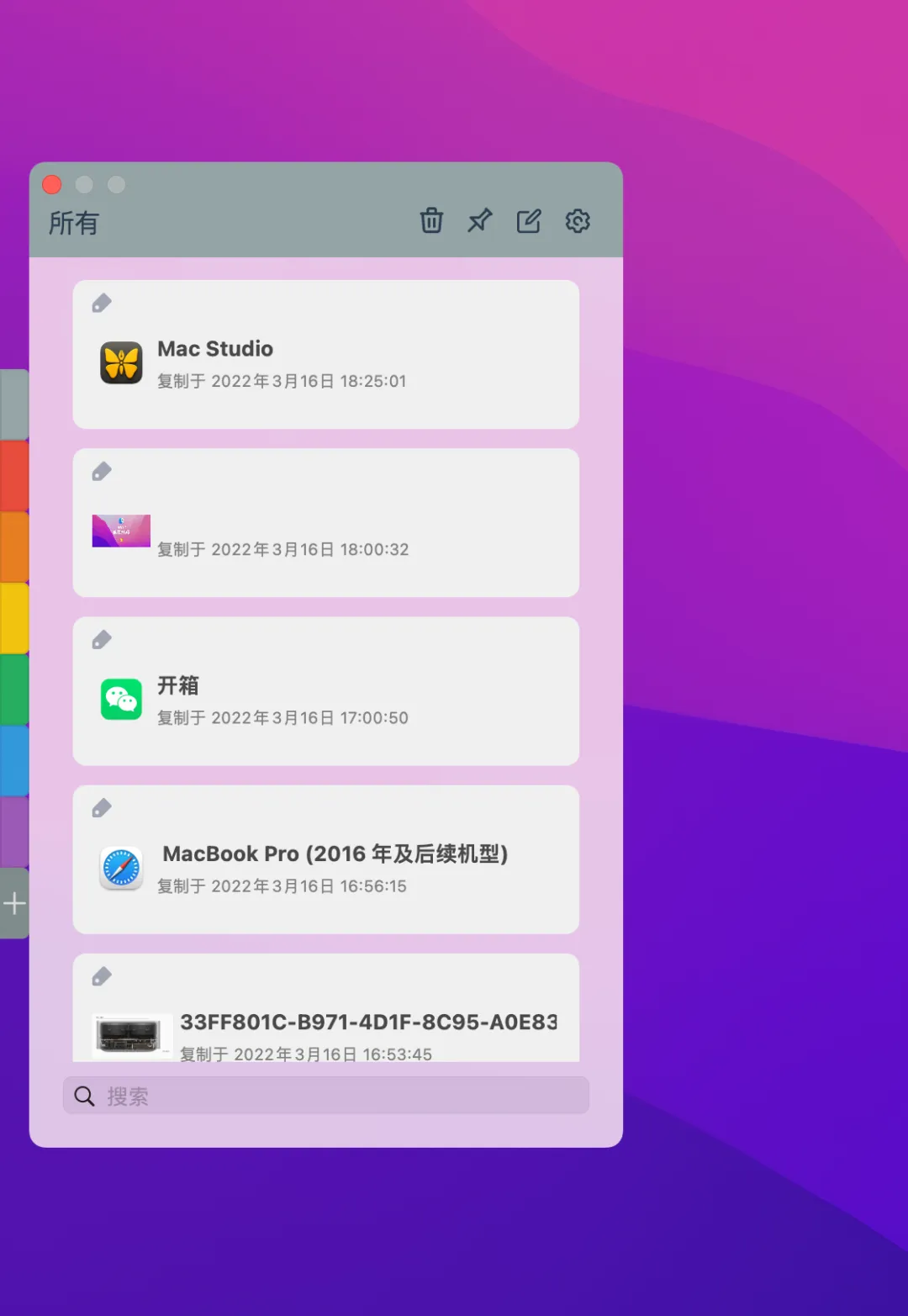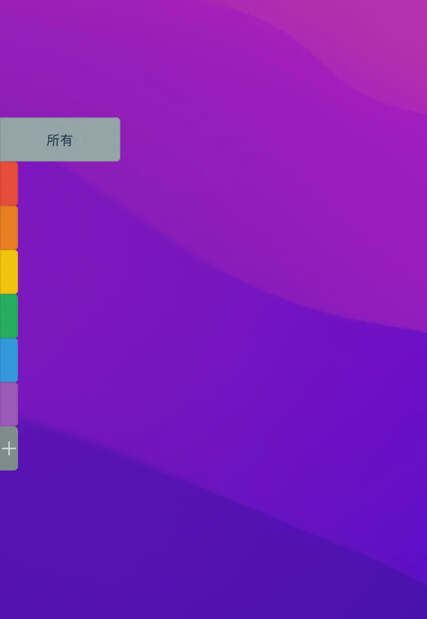 安装好 uPaste 之后,我们的 Mac 桌面左侧会显示一排彩条。这里用来查看和管理剪贴板历史。默认不同的颜色代表一个类型分组。