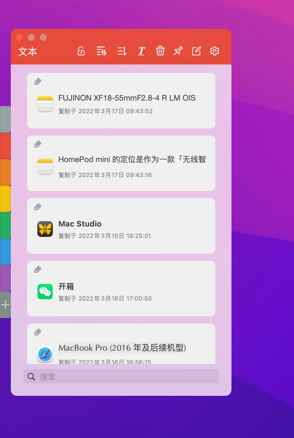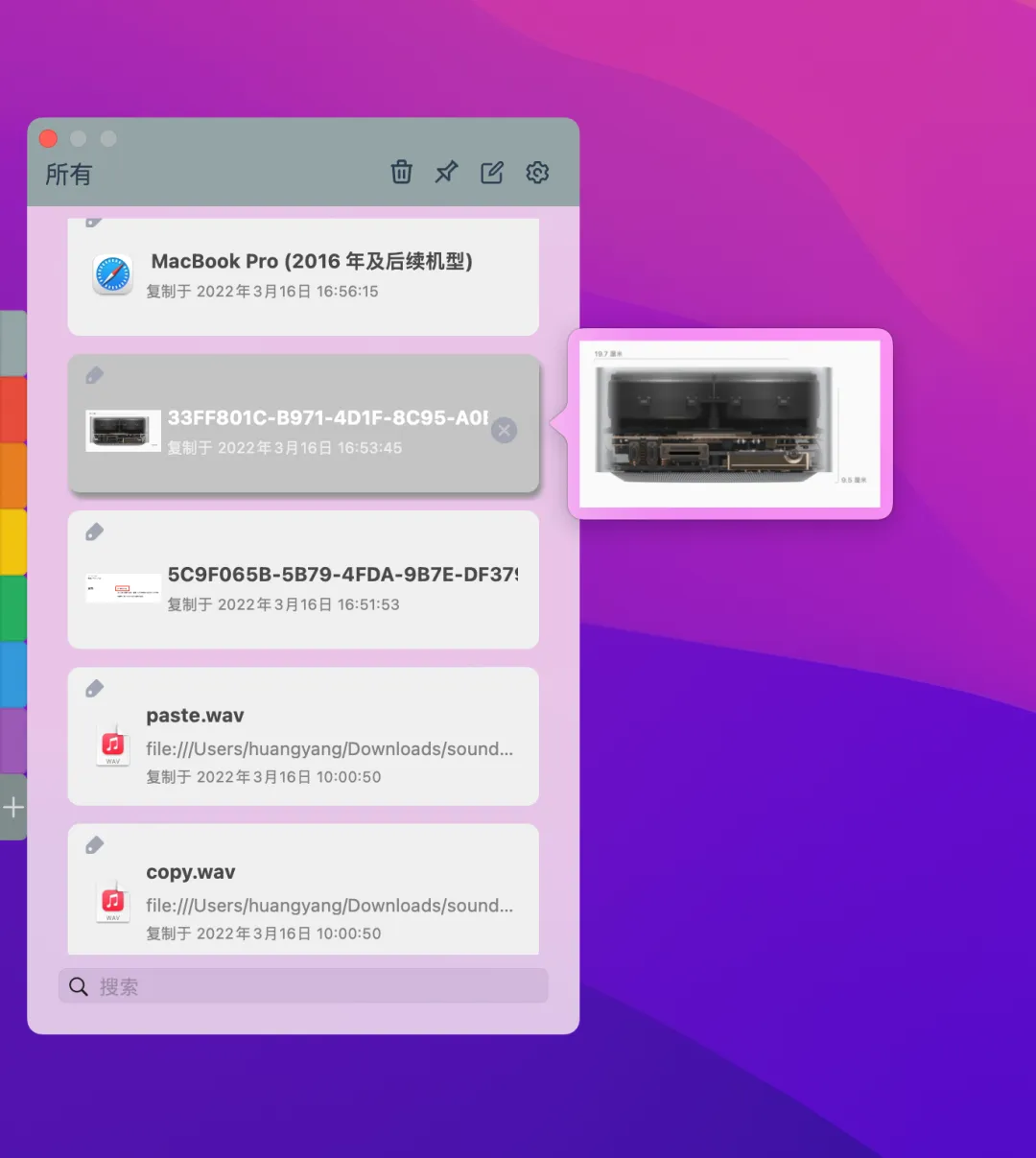 后面的每个颜色彩条代表一种剪贴板类型分组。比如文本、图片、连接、文件、笔记等。