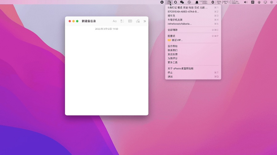 第二种方式是在 Mac 菜单栏点击 uPaste 图标,会显示最近的历史剪贴板。点击任意一个或者用快捷键 command 加序列数字就可以复制并粘贴。