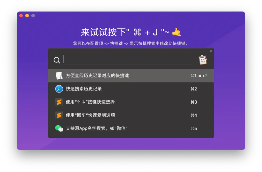 还有一种方式是使用快捷键 command-J,桌面会显示类似 Mac 聚焦搜索那样的搜索窗口。可以直接通过关键词搜索来找到历史剪贴板,也可以按上下方向键切换历史剪贴板,然后双击或者按回车键来复制并粘贴。