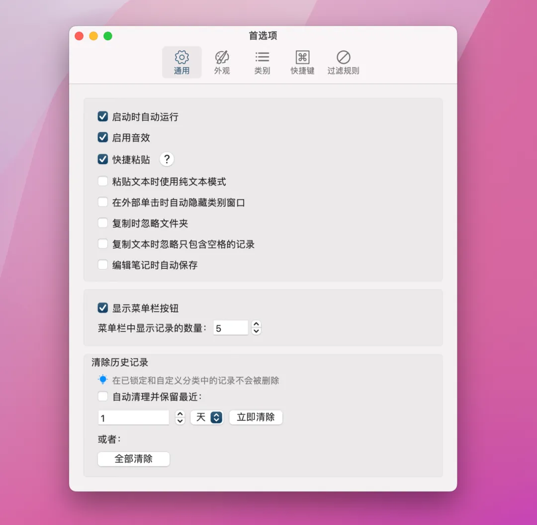 打开软件设置,可以选择是否启用音效、复制时忽略文件夹、菜单栏显示记录的数量,或者设置一段时间后自动清除历史记录。当然你也可以选择永远保留这些剪切板历史。即使在 Mac 关机重启后也不会被清除。