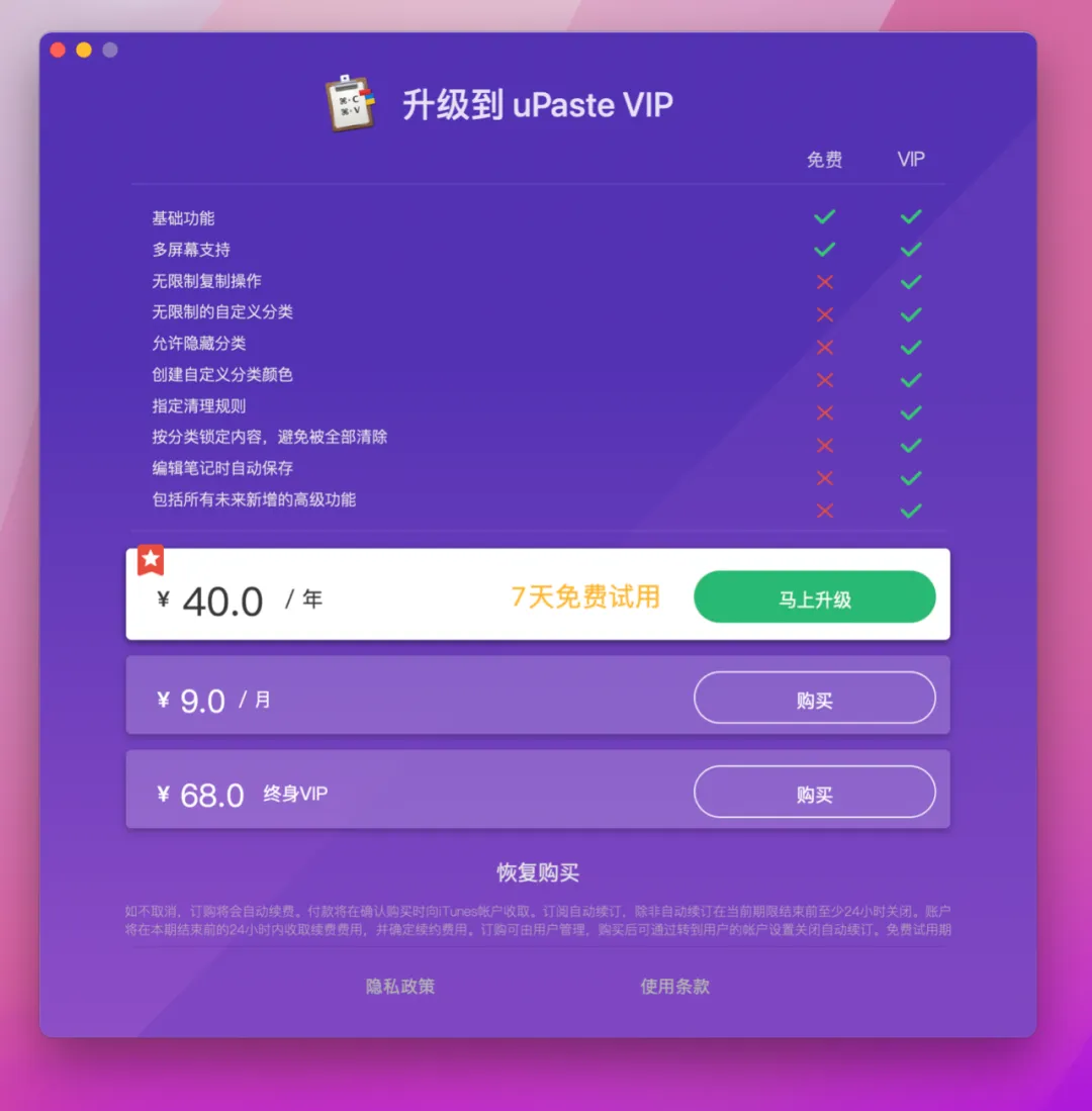 感兴趣可以在 Mac App Store 免费下载使用这款软件。免费版可以使用基础功能。解锁全部功能需要付费订阅。一年 40 的订阅价格虽然也不贵,但是如果你决定长期使用这款软件,还是建议直接买 68 的终身 VIP,毕竟现在能一次买断的好软件不多了。