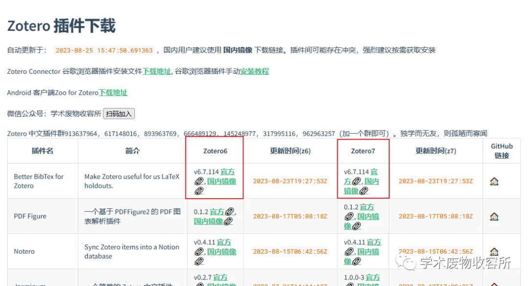 为了提供更好的下载服务,让同学们能按 Zotero 版本下载对应的插件,插件下载站的页面提供了 Zotero 6 和 Zotero 7 两个下载列表。