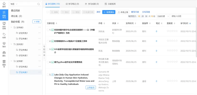 ● 平台上可以创建多级专题,对资料进行分类管理;支持通过对文献重要度打分进行排序;可在Word中直接引用文献,且有多种样式可选,有助于我们进行高效率的文献管理。