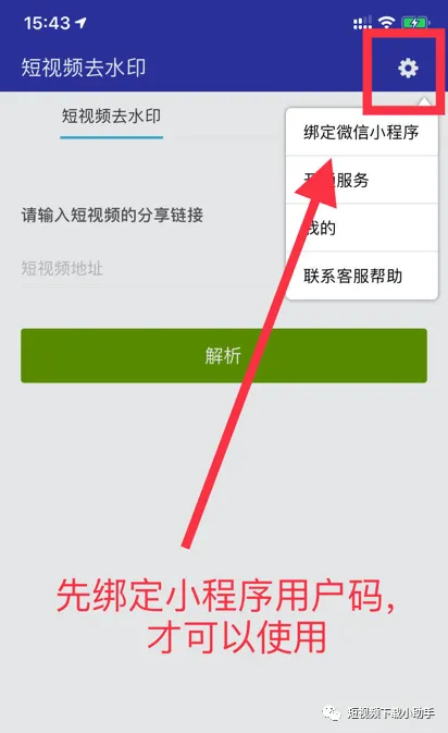 苹果手机:本公众号内回复 苹果app安卓手机:本公众号内回复 安卓app通过上述方法可以,获取各自的安卓链接。app安装后,需要绑定小程序的用户码, 共享小程序开通的解析次数。