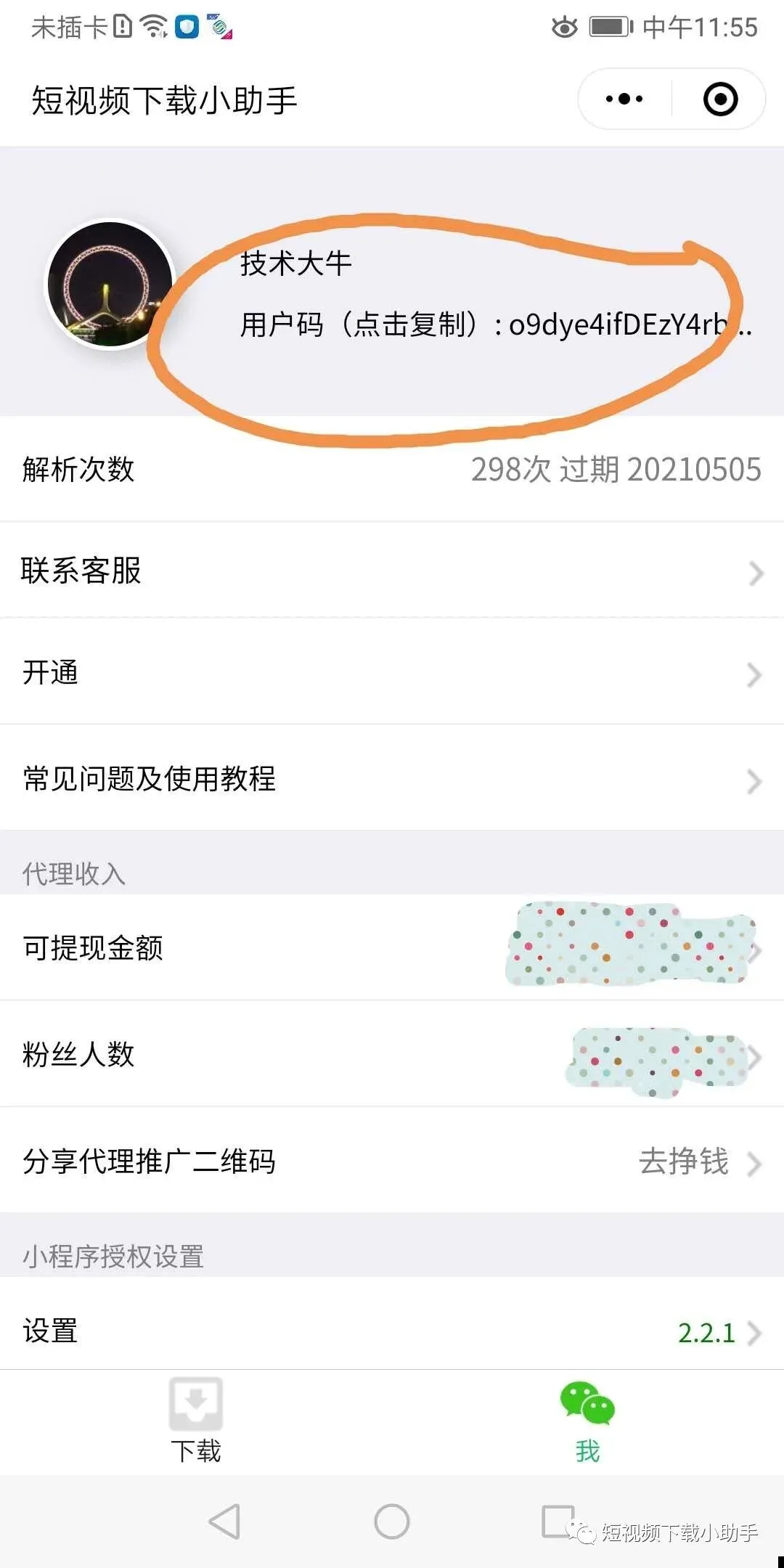 打开笔者开发的小程序, 找到下图对应位置的用户码, 点击复制,绑定到app里即可。
