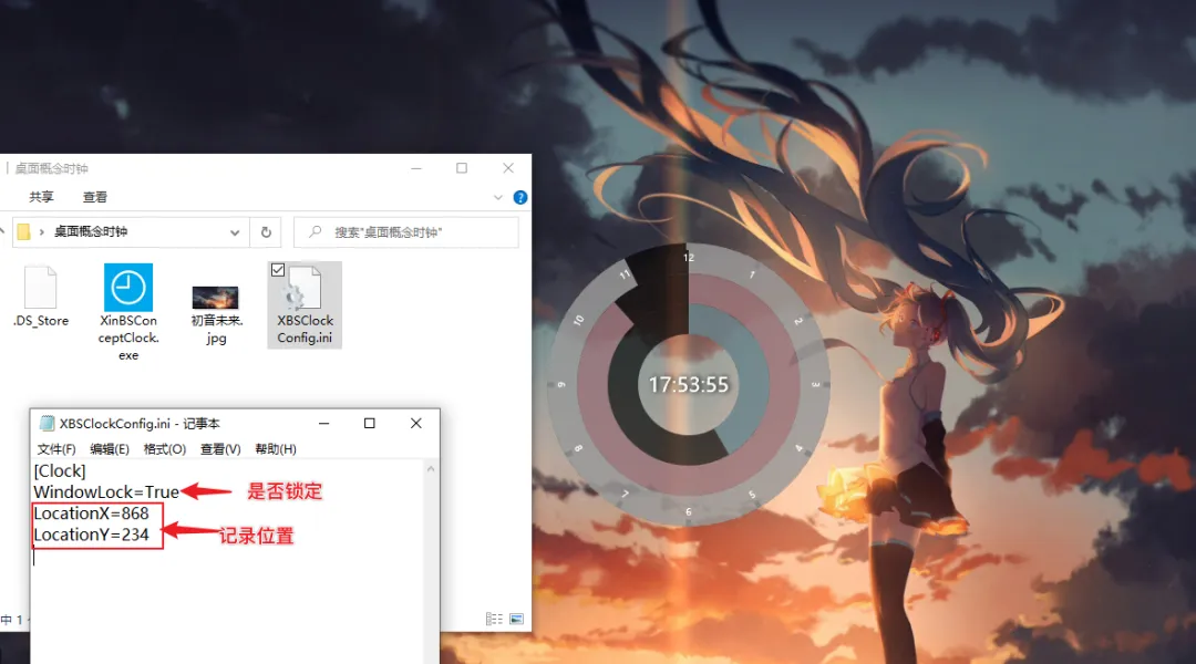 首次使用后,时钟同级目录会自动生成一个配置文件,配置文件会自动保存时钟的位置,以及时钟是否锁定(锁定后无法被鼠标选中),如果你手动删除,则时钟再次启动则会出现在桌面右上角~