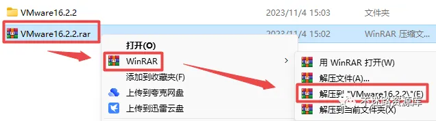 1.选中下载的压缩包,然后鼠标右键选择解压到“VMware16.2.2”(没有解压选项点这里)