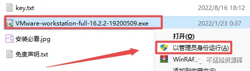 2.打开刚刚解压的文件夹,鼠标右键点击“VMware-workstation-full-16.2.2-19200509.exe”选择“以管理员身份运行”