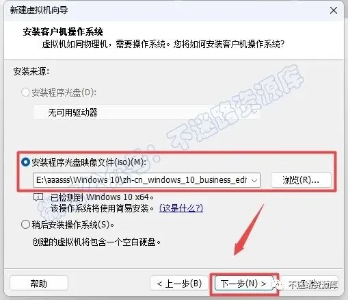 18.点击“浏览“选择需要在这台虚拟机上面安装的windows系统镜像,显示“已检测到·····“,点击“下一步“