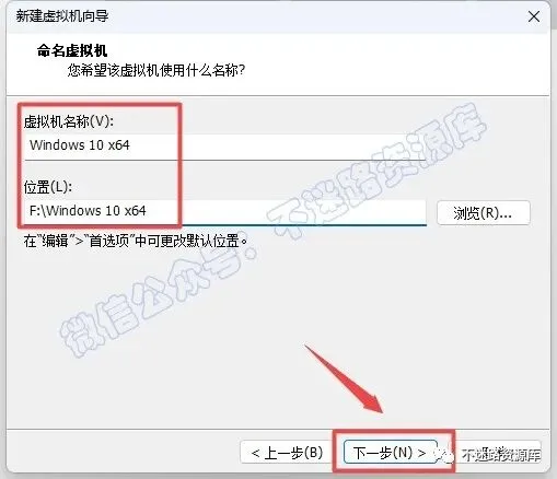 21.自行修改虚拟机名称和位置,点击“浏览”选择安装路径,建议和教程中的保持一致,本例安装到F盘(将路径地址中的首字符C改为D表示安装到D盘,安装路径不要出现中文),点击“下一步“