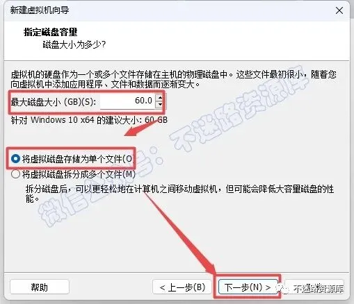 22.选择磁盘大小(最低60G),勾选“将虚拟磁盘存储为单个文件”,点击“下一步“