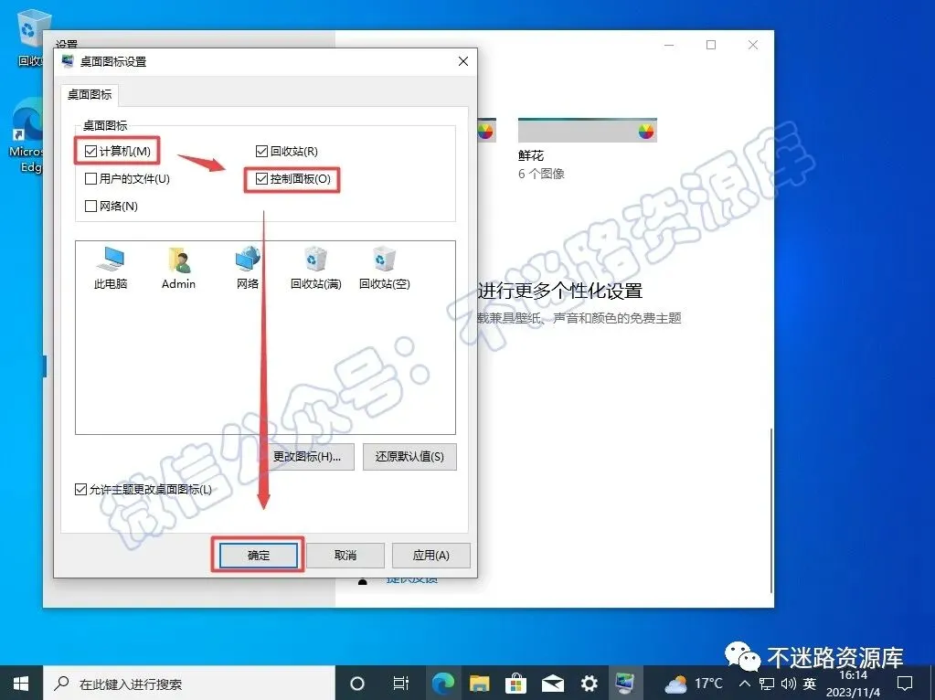 32.将计算机、控制面板勾选上,点击“确定“