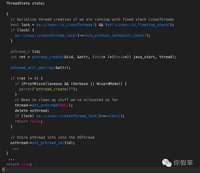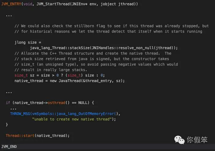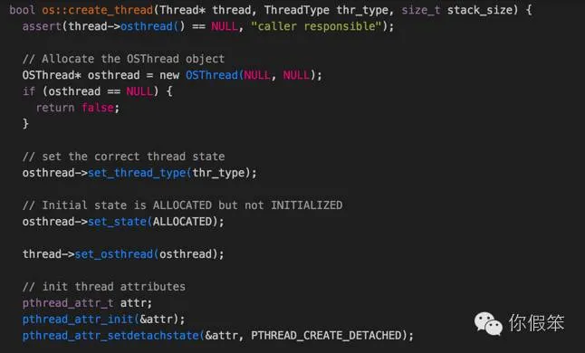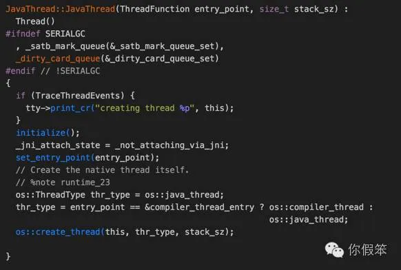 另外大家应该注意到了native_thread = new JavaThread(&thread_entry, sz),在这里才会真正创建一个线程