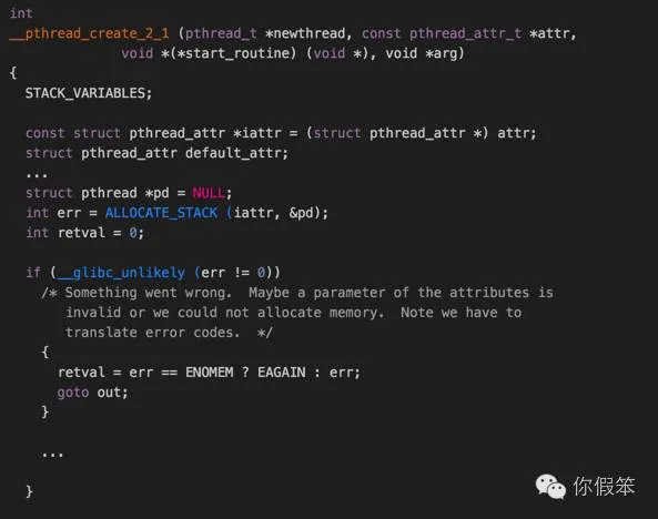 上面我主要想说的一段代码是int err = ALLOCATE_STACK (iattr, &pd),顾名思义就是分配线程栈,简单来说就是根据iattr里指定的stackSize,通过mmap分配一块内存出来给线程作为栈使用