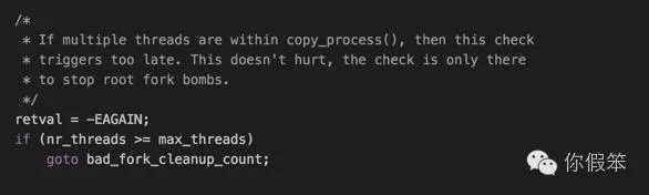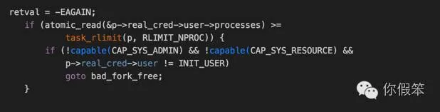 先看这么一段,这里其实就是判断用户的进程数有多少,大家知道在linux下,进程和线程其数据结构都是一样的,因此这里说的进程数可以理解为轻量级线程数,而这个最大值是可以通过ulimit -u可以查到的,所以如果当前用户起的线程数超过了这个限制,那肯定是不会创建线程成功的,可以通过ulimit -u value来修改这个值