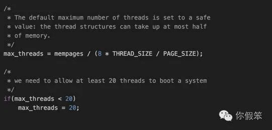 如果要修改或者查看可以通过/proc/sys/kernel/threads-max来操作, 这个值是受到物理内存的限制,在fork_init的时候就计算好了