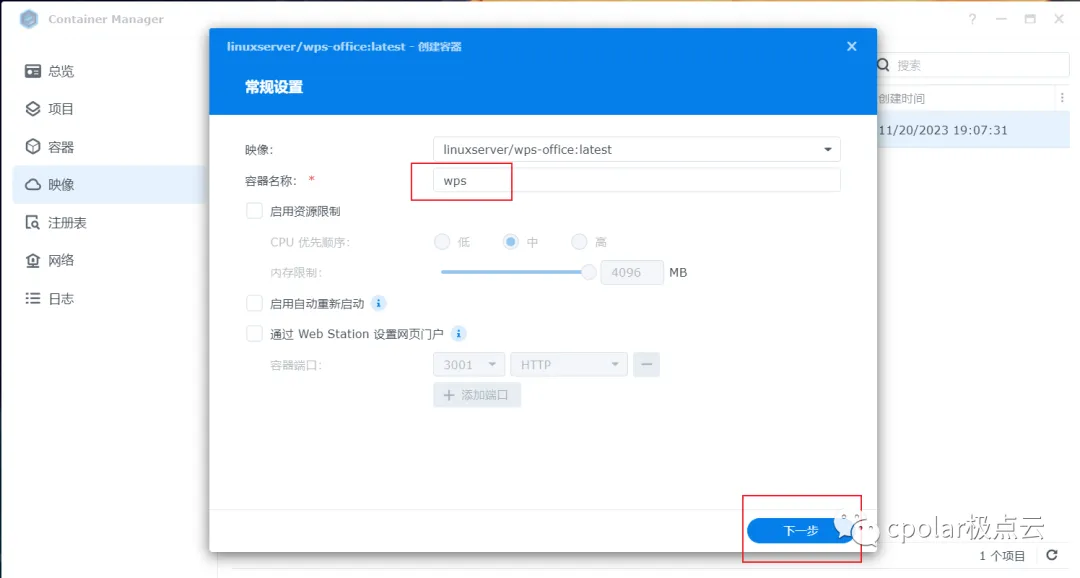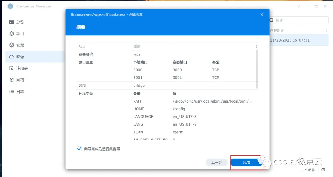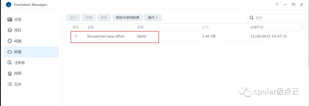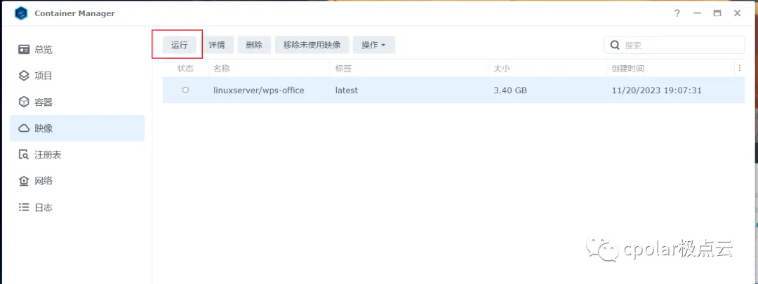 拉取后我们在群晖容器管理界面可以看到拉取的wps镜像,获取wps镜像就完成了,下面进行运行启动