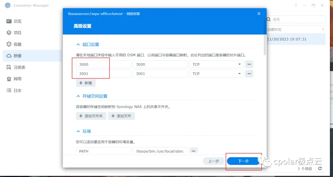然后设置挂载的端口,默认和容器内部端口即可,然后点击下一步