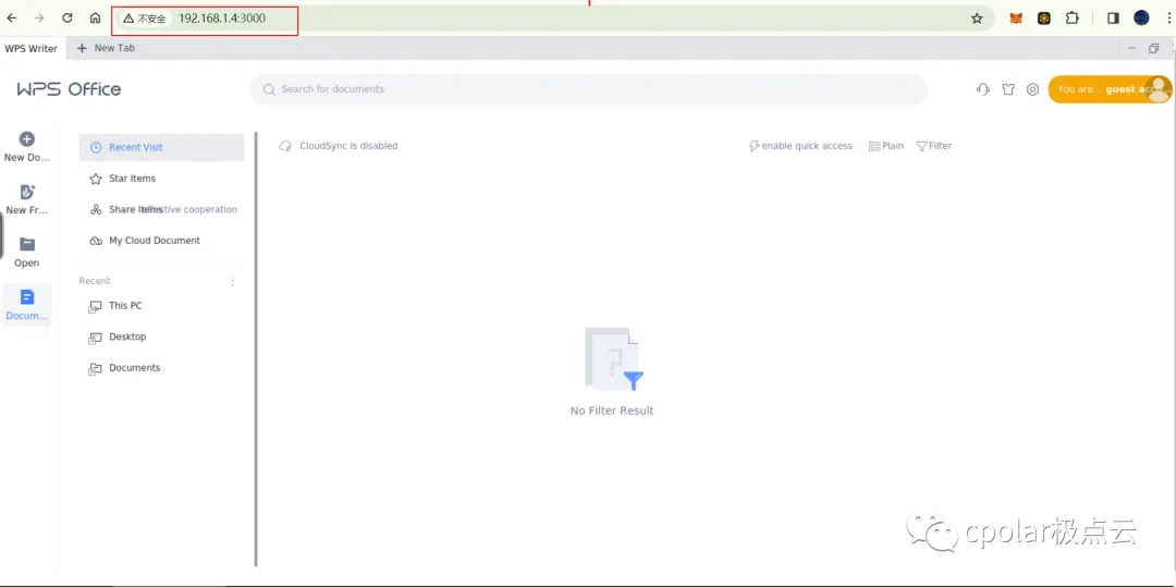 使用上面的Cpolar http公网地址,在任意设备的浏览器进行访问,即可成功看到wps office界面,这样一个公网地址且可以远程访问就创建好了,使用了cpolar的公网域名,无需自己购买云服务器,即可发布到公网进行远程访问 !