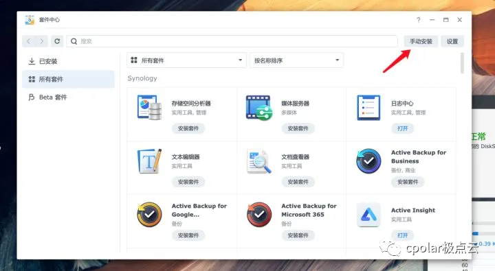 打开套件中心,点击右上角的手动安装按钮。