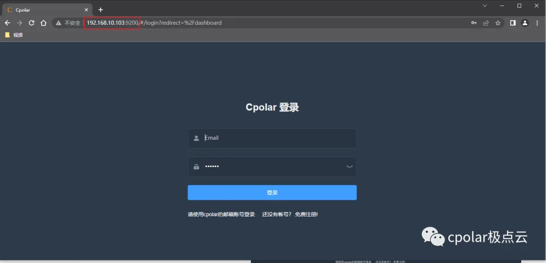 安装完成后,在外部浏览器,我们通过群晖的局域网ip地址加9200端口访问Cpolar的Web管理界面,然后输入Cpolar邮箱账号与密码进行登录