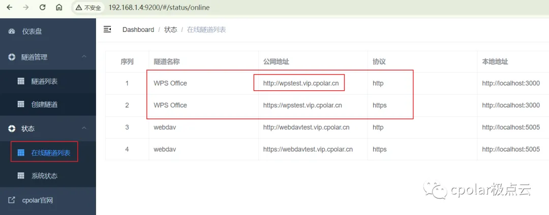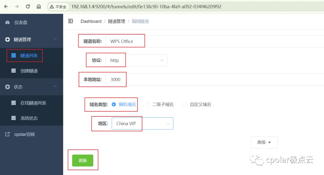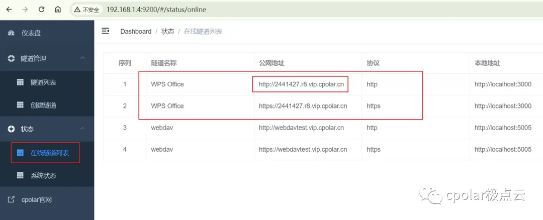 点击左侧仪表盘的隧道管理——创建隧道,创建一个wps office的公网地址隧道!