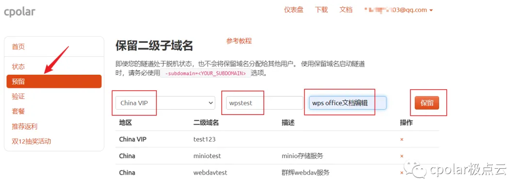 登录cpolar官网,点击左侧的预留,选择保留二级子域名,设置一个二级子域名名称,点击保留,保留成功后复制保留的二级子域名名称