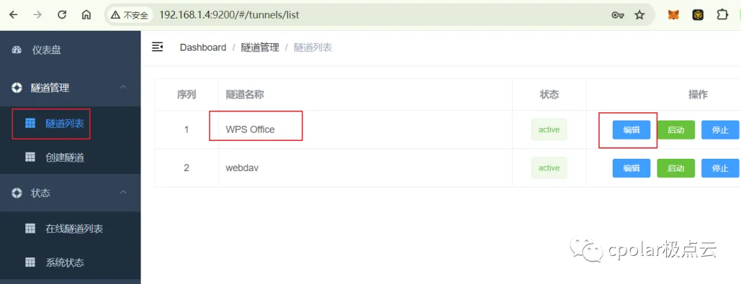 返回登录Cpolar web UI管理界面,点击左侧仪表盘的隧道管理——隧道列表,找到所要配置的隧道,点击右侧的编辑