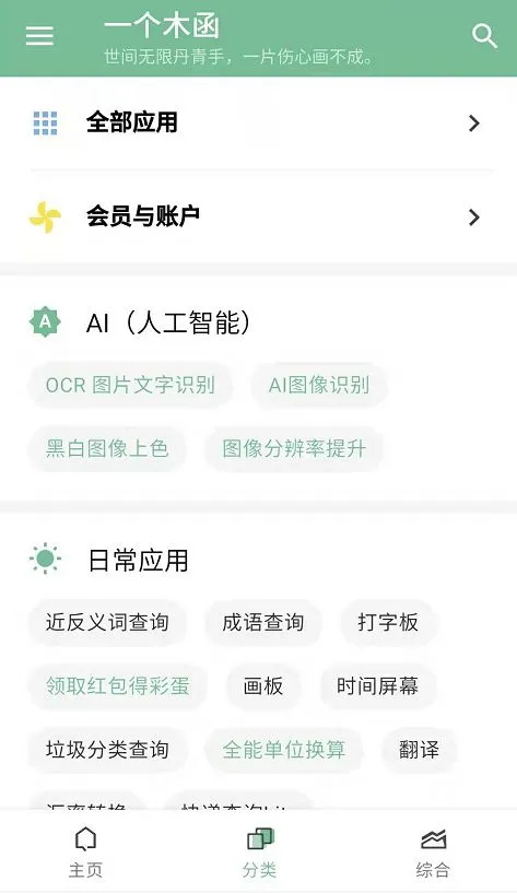 一个木函自动将所有小工具分成8大类,除了AI小工具需要付费,其它基本免费。拥有一个,完全可媲美十几个特定需求的软件或者小程序。