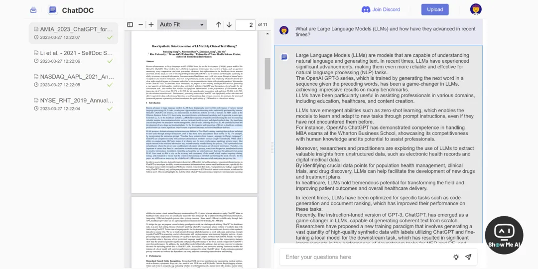 🌍ChatDOC[5] 是一个基于 ChatGPT 的文件阅读助手,支持中英文,可以快速从上传研究论文、书籍、手册等文件中提取、定位和汇总文件信息,并通过聊天的方式在几秒钟内给出问题的答案。