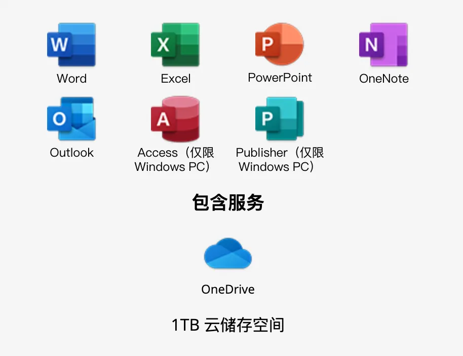 Microsoft 365 ,Office 办公软件的订阅服务。包含 Word、Excel、PowerPoint、Outlook、Publisher、Access(后两者只有 Windows 版),还有 1TB 的 OneDrive 云盘存储空间。