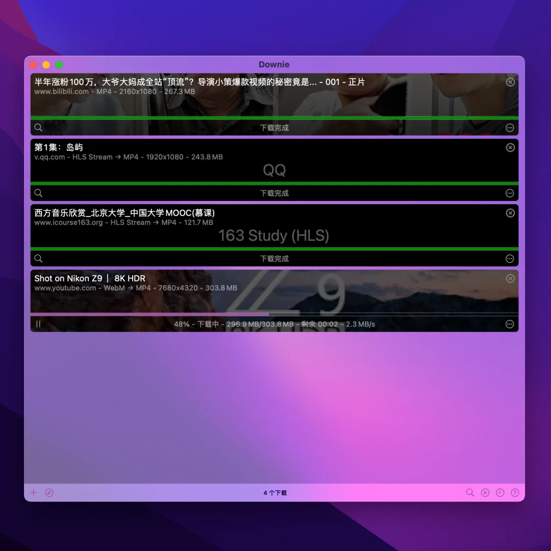 只需将视频网页链接拷贝,然后打开 Downie ,按 command-V 粘贴,就会自动下载。可选画质,最高支持 8K,下载时可直接转成 MP4 格式;可选是否下载字幕,也可仅提取音频,非常方便。