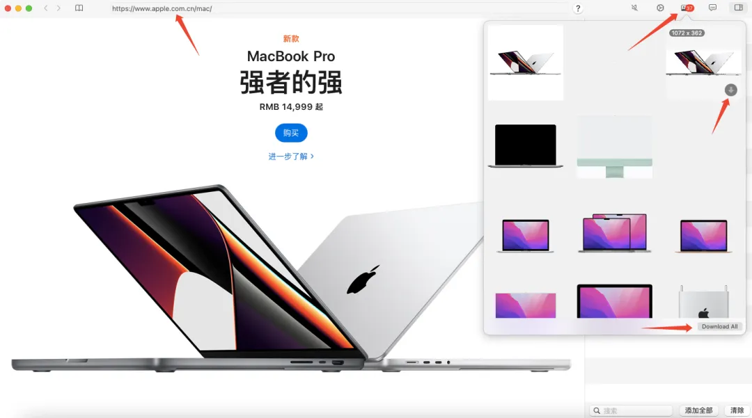 随着网页的滑动,右边会显示网页中的图片,可以下载单张,也可以批量下载。