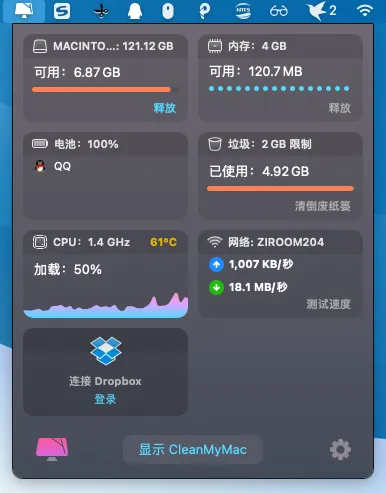 还支持状态栏显示电脑的各种信息,包括硬盘空间、内存占用、网速、耗电的软件等,让你随时掌握电脑状态;