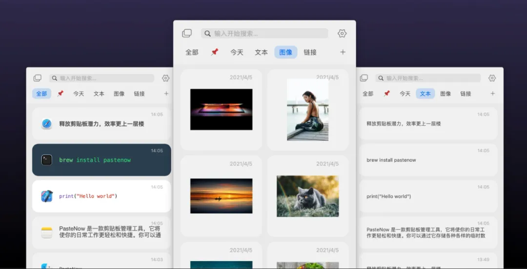 有了 Pastenow 这款剪贴板工具,只需拷贝一次,便可将拷贝的文字链接/图片等保存起来,并且可以根据自己的需要对它们分类管理,然后只需一个快捷键,即可调出内容,重复粘贴使用,高效便捷。