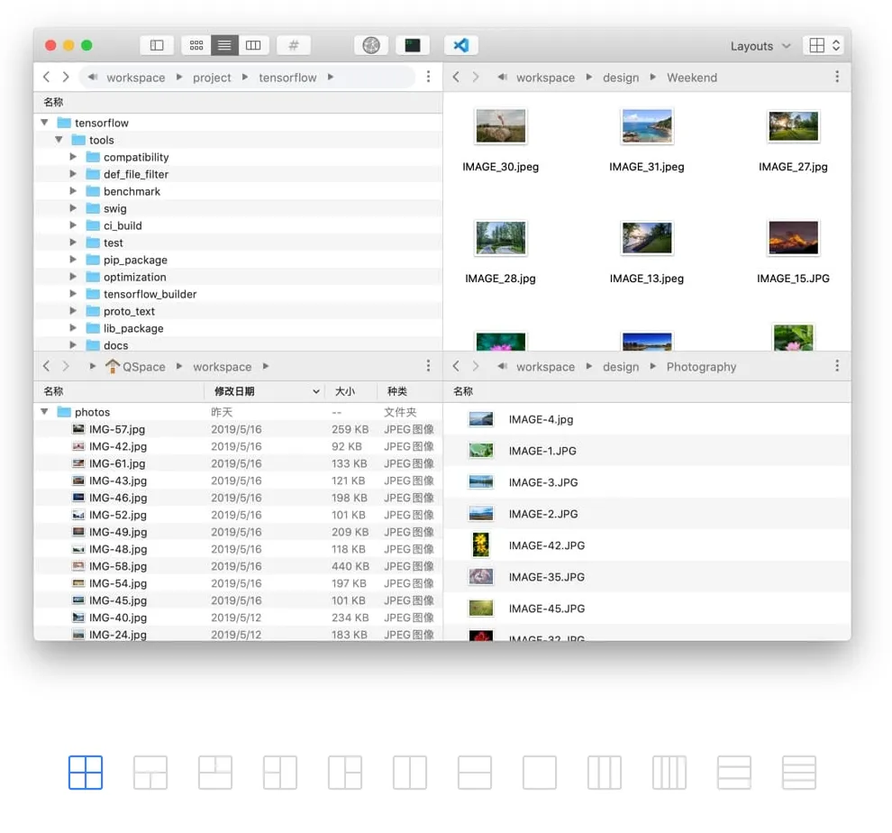 QSpace 是麦壳良品刚上架的一款新品。 被称为增强版访达。它可以在一个窗口内同时展开多个不同位置的文件夹,多达 12 种视图,随你切换,让跨文件夹拖动整理文件更方便,还支持将布局保存为工作区,下次要用时直接开启。