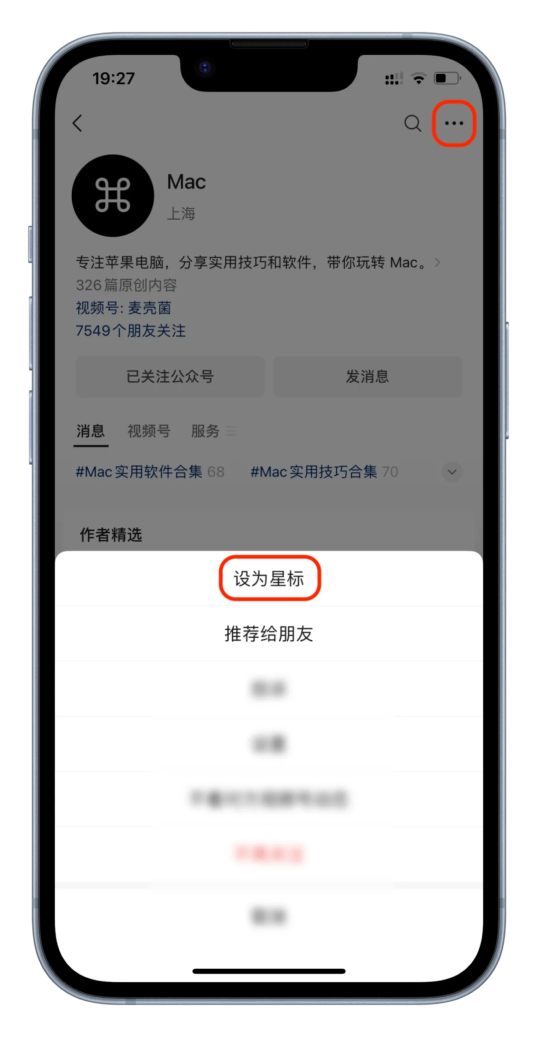 由于公众号文章推送规则改版,导致没那么容易刷到 Mac 的推文,可以将「Mac」设为星标,这样就能在发文的第一时间看到啦。点击公众号主页右上角的三个点,再点击「设为星标」即可。